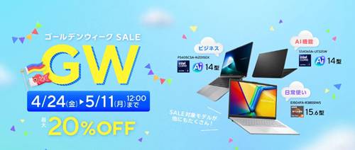 ASUS(エイスース)公式サイトでは【最大20%OFF】「ゴールデンウィークセール」開催中♪