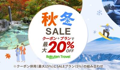 楽天トラベルでは、【最大15%割引クーポン】+【5%OFF】「秋冬セール」開催中です!