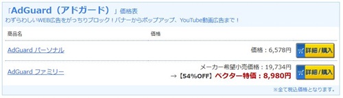 パソコンソフト専門ショップ「ベクター」では、時期によって「AdGuardファミリー(9台まで利用可)無期限版」が【50%OFF以上の大幅割引】のセール価格で購入できることがあります。