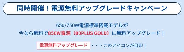 「650/750W電源標準搭載モデル」⇒「無料で850W電源(80PLUS GOLD)」に無料アップグレード!