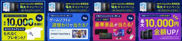 対象のGALLERIA購入で「オリジナルTシャツ」「ゲームソフト」「周辺機器」「最大10,000円買取金額UP」の4大キャンペーン実施中です!