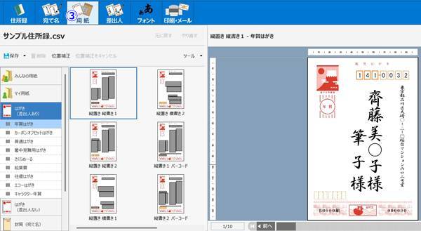 年賀はがき、普通はがき、暑中見舞い、往復はがきなどの使用する用紙の種類を選びます。