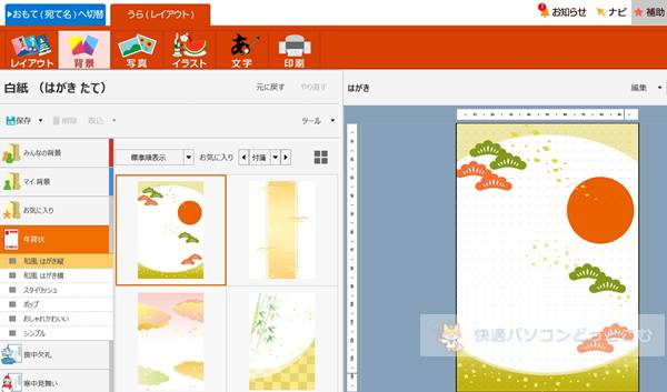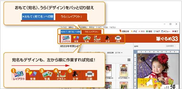 「おもて」「うら」ともに、左から順に進めれば年賀状が完成するので初めて利用する方にも分かりやすいです!
