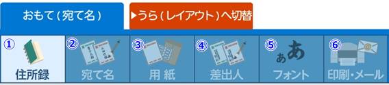 「おもて」:①住所録 ②宛て名 ③用紙 ④差出人 ⑤フォント ⑥印刷・メール