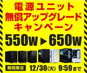 パソコン工房では、対象の「550W電源ユニット」を搭載する対象デスクトップパソコンを「650W電源ユニット」へ無償アップグレードキャンペーン実施中!