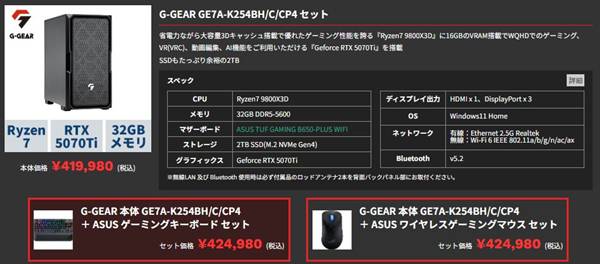 - 【Ryzen7 9800X3D×RTX5070Ti】419,980円(税込)